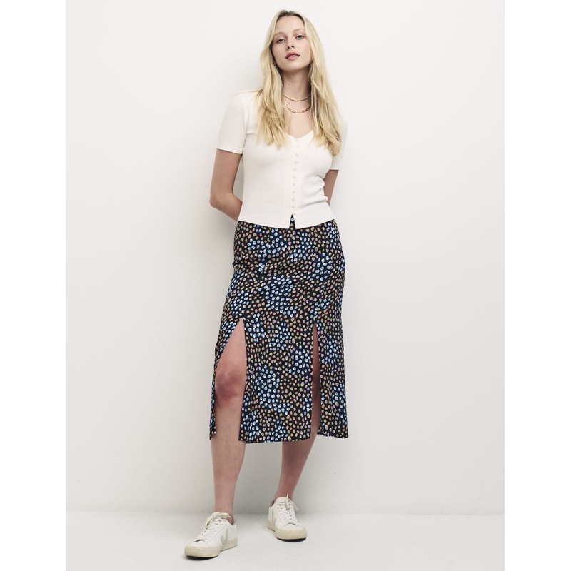 Printed with a scattered smudge print, this Sara midi skirt is equal parts classic black yet colourful. . Pair with a cute top for a look thatll take you anywhere. Double side slits Concealed zip fastening