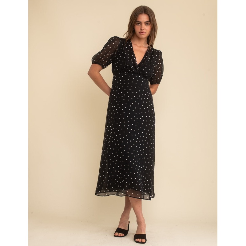 You cant go wrong with a dress like this. This wrap-effect midaxi will work for all manner of occasions. We love the slightly sheer chiffon in black with white polka dots. Detail comes in the form of super pretty puff sleeves and a tie-up back that loops into a bow. Slip into mules and go.