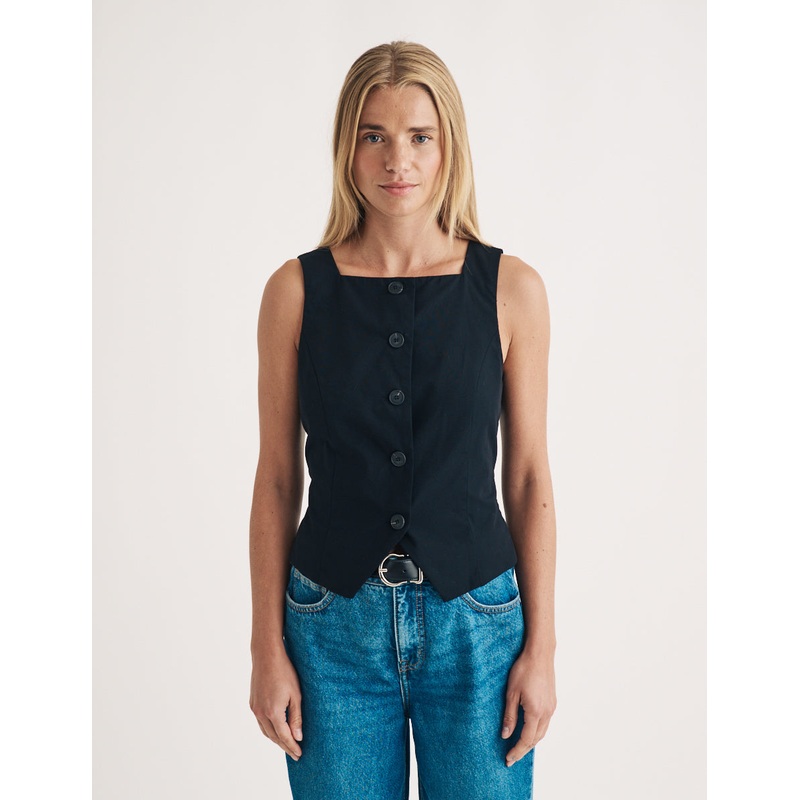 Stay cool. This waistcoat comes with a sleek square neckline and classic button front. Its so-now and so wearable. Were wearing ours with denim and flat pumps.