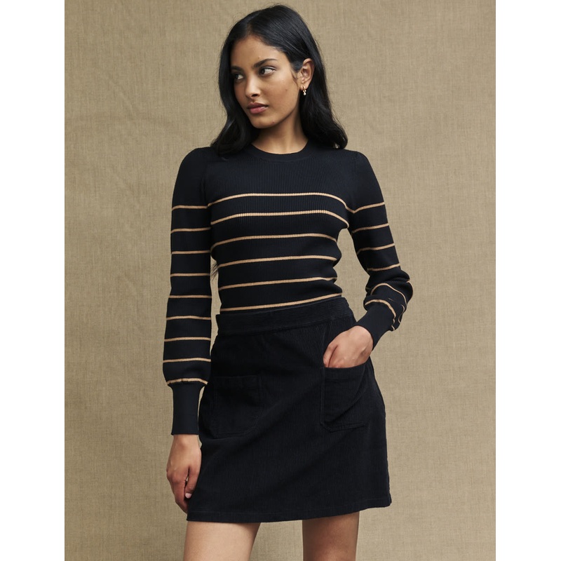 Line this up in your wardrobe. Tthis black top comes knitted with oatmeal stripes. The round neckline gives this style its classic credentials whilst the balloon sleeves add a little so-now flair. Team yours with a cord mini.