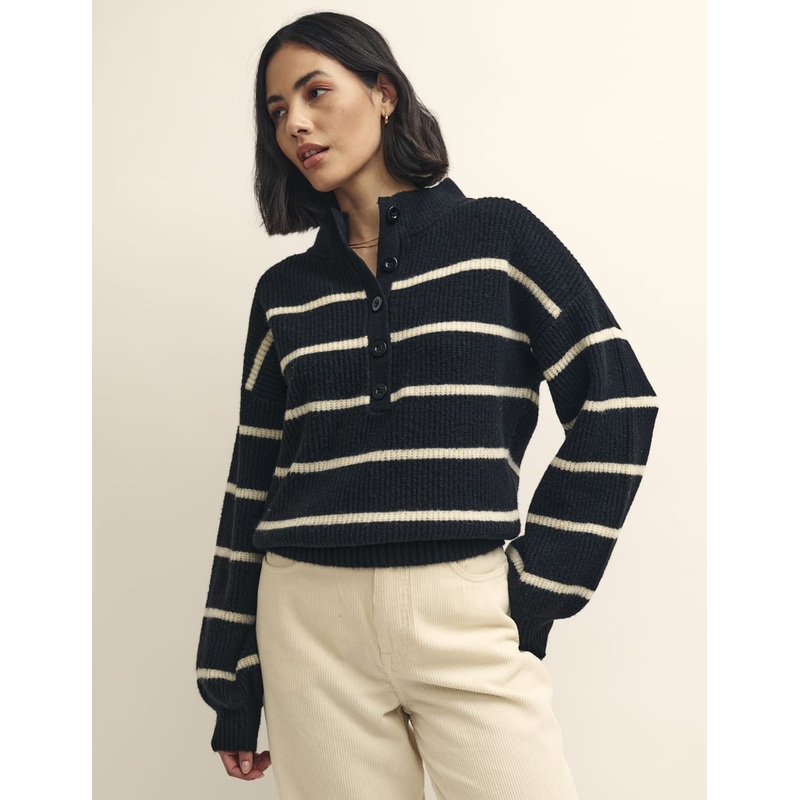 A contemporary take on Breton stripes. Its also shaped to a relaxed fit, finished with a half-button placket and chunky ribbed edges. Style yours with cream cord trousers. Funnel collar Half-button packet Ribbed trims Designed for a relaxed cut