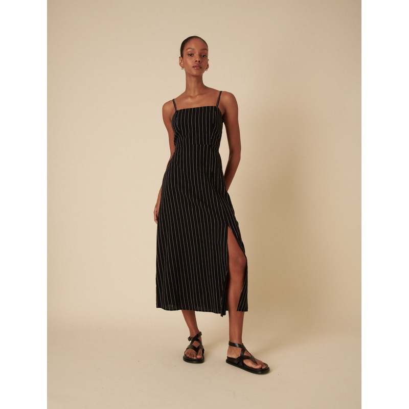 Meet Maddie, your new favourite midi. Coming in an on-trend pinstripe, shes finished with spaghetti straps and a side slit. And the perfect fit? Youve got a little shirring at the back to thank for that. Elevate yours with gold jewellery.
