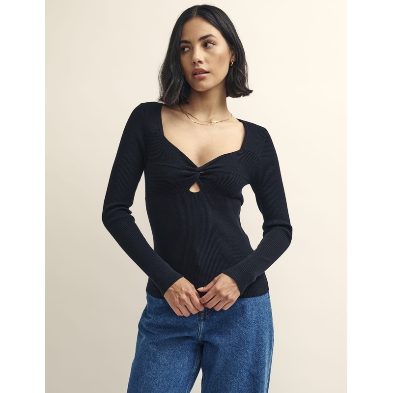 Plot twist. This classic black knitted top is sure to bring the drama on your next casual night out. Just add layers of gold jewellery. Sweetheart neck Long sleeves Ribbed texture Designed for a close cut