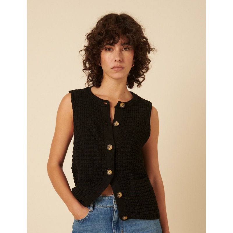 Your new go-to layer. Coming in classic black, our knitted waistcoat is all about texture and charm. We love the contrast button front, chunky knit, and patch pockets. Layer it over a tee or style solo with jeans. Sleeveless Chunky knit Button-up front We