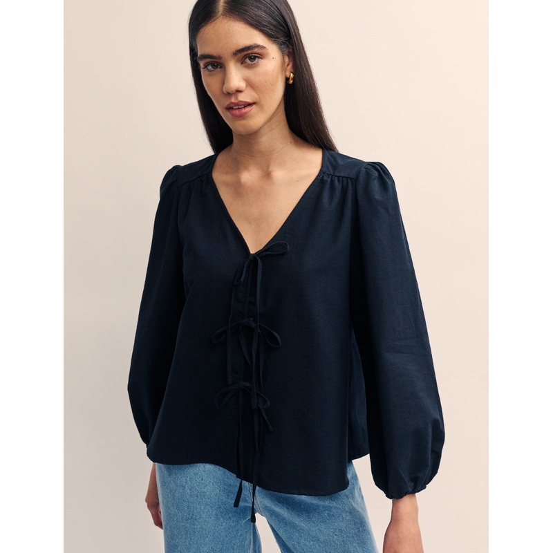 So breezy. A trio of string ties details the front, creating a so-now spin on a classic look. Style yours with wide leg trousers.V-neckLong blouson sleevesString tie fasteningBoxy cut