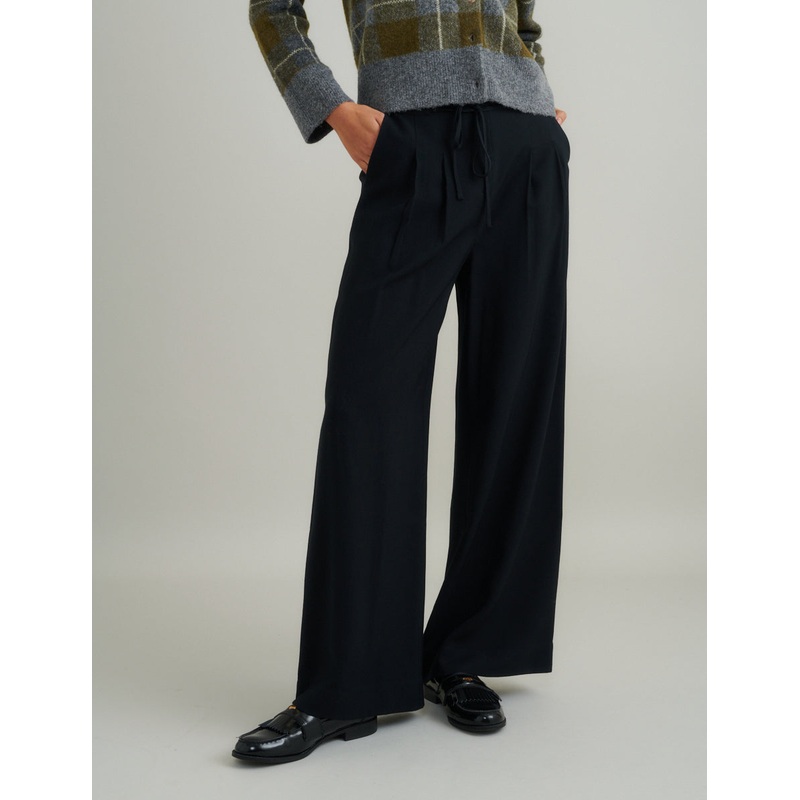 The definition of relaxed tailoring. These classic black trousers sit high on the waist with a double pleat front and a stylish wide leg. We love the self tie fastening at the front. Style yours with a cardi and loafers.