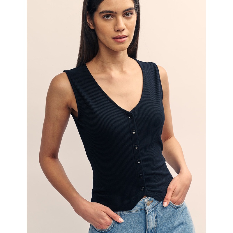 You havent got this one yet. This black sleeveless top takes style notes from this seasons most on-trend piece: the waistcoat. A flattering v-neckline is accompanied by a pretty line of buttons. Wear yours with everything you already own.