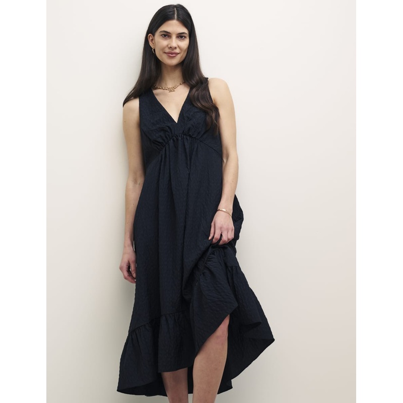 This black smock dress is sure to be worn on rotation. The fabric is textured with a light crinkle that feels effortlessly summary. Let the sleeveless design show off your shoulders, whilst a tier balances the whole look. Load up on gold accents for low-key events.