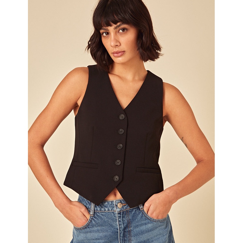 A tailored take on everyday. Coming in classic black, our waistcoat features a structured cut with a single-breasted front. Were wearing ours solo with jeans or with our matching white trousers. V-neck Button-up front Size tip: we recommend your usual size
