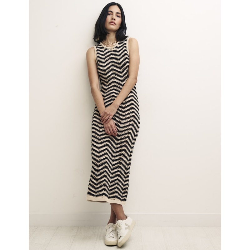 Is the sun out yet? This crochet look dress and it wants to go on holiday with you. We love the black and cream chevron stripes and the racer shape. Wear with stompy boots now and trainers later.Round neckCrochet stylePair with the matching cardiganMachine