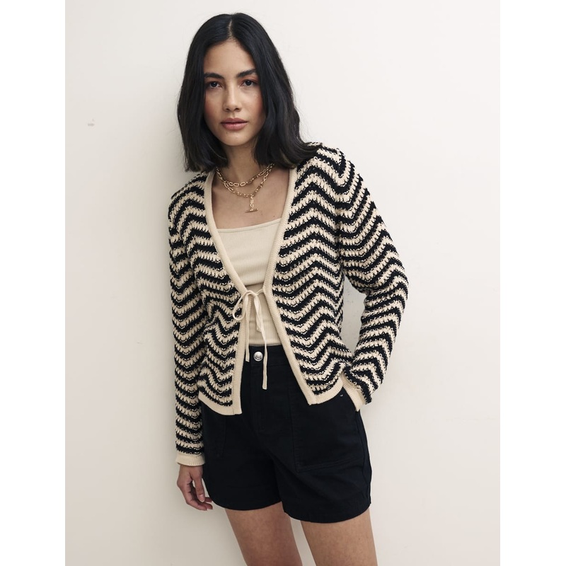 A must-have. This cardigan has a crochet look that culminates in stylish black and cream chevron stripes. Tie it up over a tee or team with a crop top for festivals. Its perfect for the modern bohemian.Tie frontCrochet styleLong sleevesPair with the matchi