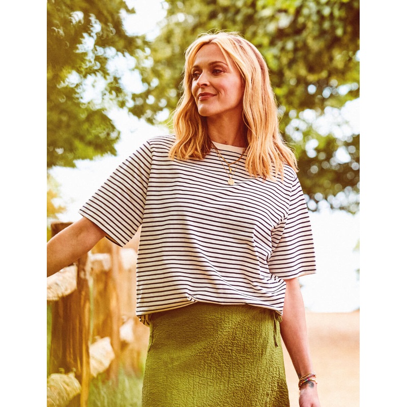 The collaboration youve all been waiting for is back: Nobodys Child x Happy Place by Fearne Cotton. Like a ray of wearable sunshine, this collection beams with joy a fusion of Fearnes signature style and our love for responsible fashion. Made entirely from super soft organic cotton, this cream and black stripe t-shirt is perfect for slow weekends. Wear it oversized or tuck the long line cut into skirts or jeans.