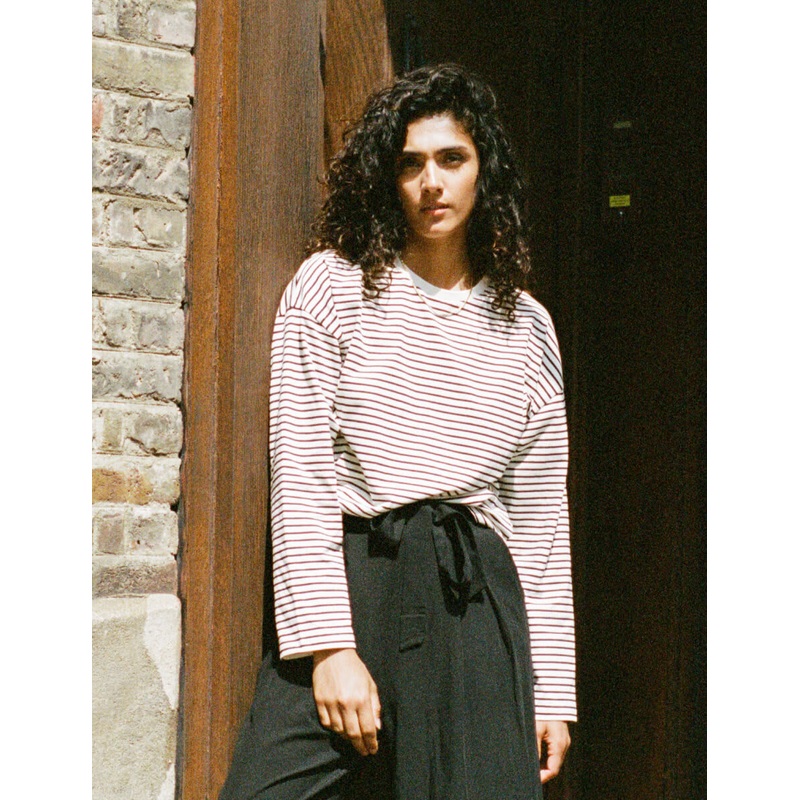 Easy does it. With dropped sleeves, this long sleeve top is a relaxed essential. The cream and black stripe design is truly timeless. Style yours with shorts now and high waisted denim later.