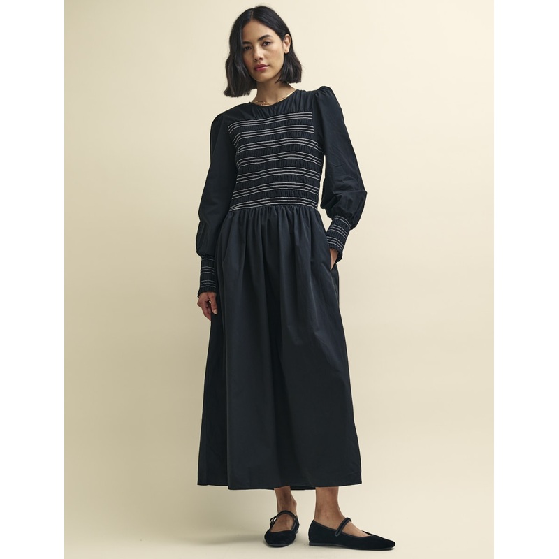 The prairie dress just got a whole new look. Maries a black midi with a difference. Statement white stitching elevates the look whilst shirring accentuates pretty balloon sleeves and a swishy skirt. Layer yours with hints of gold jewellery.