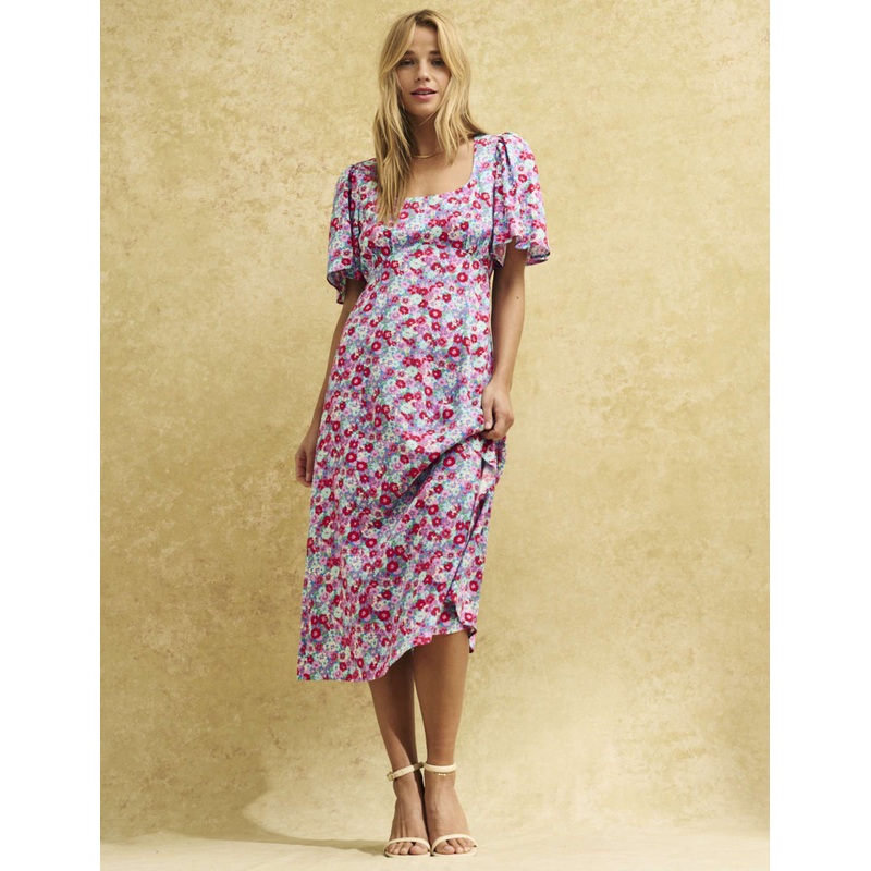 We love a floral dress and Dee Dee is no exception in this orange print popping with painted flowers. With feminine fluted sleeves and a scoop neck, shes super easy to wear with a cut that feels a little bit different from the midis youve already got. We love the elongating side slit. Style yours with barely-there sandals for that garden party coming up.
