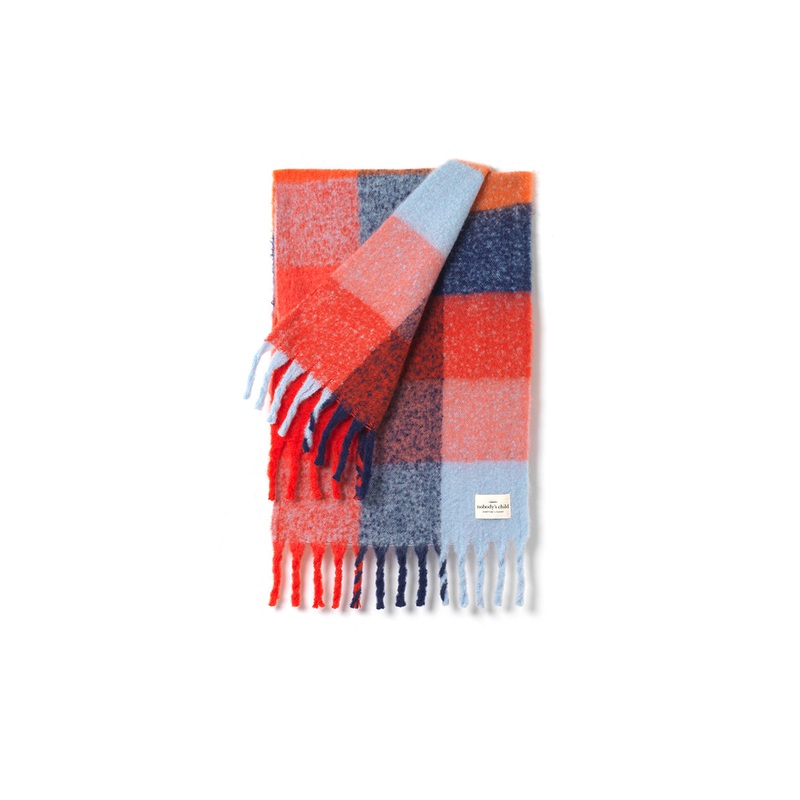 Let our scarf do all the talking. Fluffy, warm and in a vibrant blue and red check, our woven scarf with brighten up every outfit. Were wearing ours over a monochrome look.