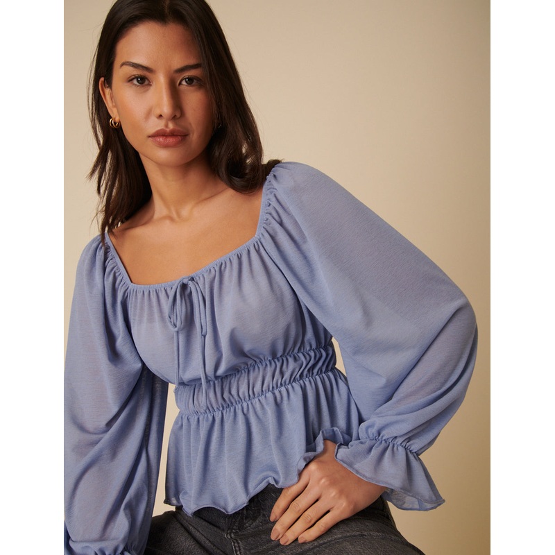 Oh so breezy. We love the long balloon sleeves and elegant square neckline on our new blue blouse. The elasticated cuffs and trio of ties are the perfect finishing touches. Style with everything you already own. Square neck Long balloon sleeves String tie