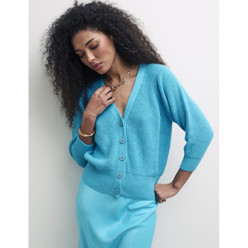 Youve got to love a good chunky knit even in summer. Easy for layering or styling solo, were wearing ours with gold accents and a tonal satin skirt on cool evenings. V-neck sleeves Buttons Ribbed texture