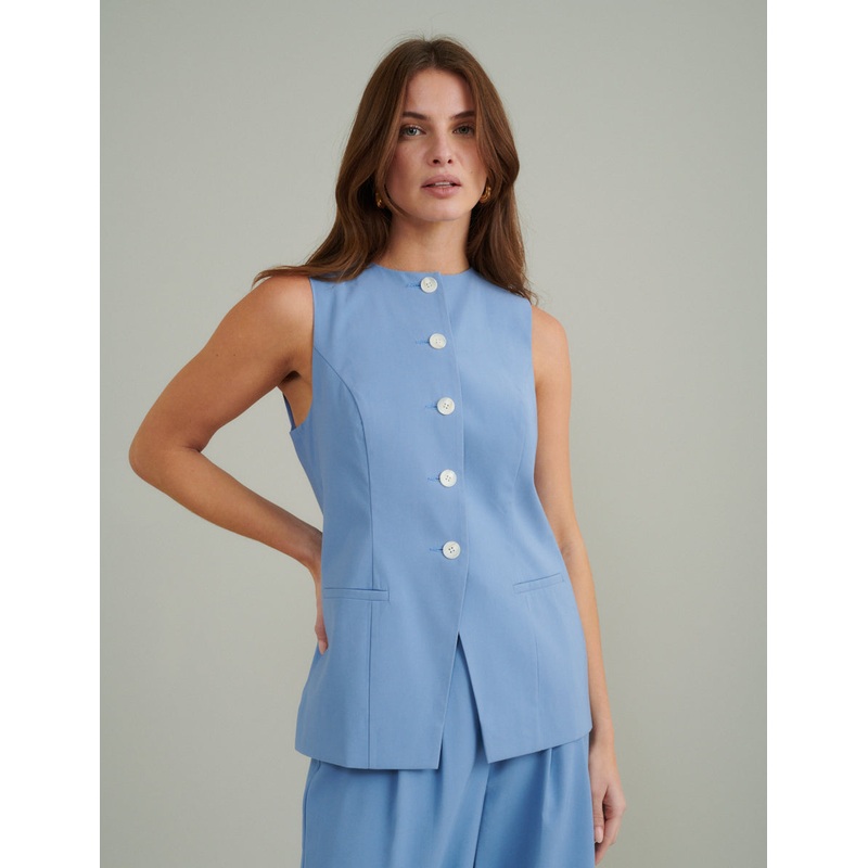 Calling all cool girls, your favourite waistcoat is back but this time in blue. Were obsessed with the exaggerated hemline and long line of contrasting white buttons. Wear yours with wide leg jeans or the matching trousers. Round neck Button front Welt poc