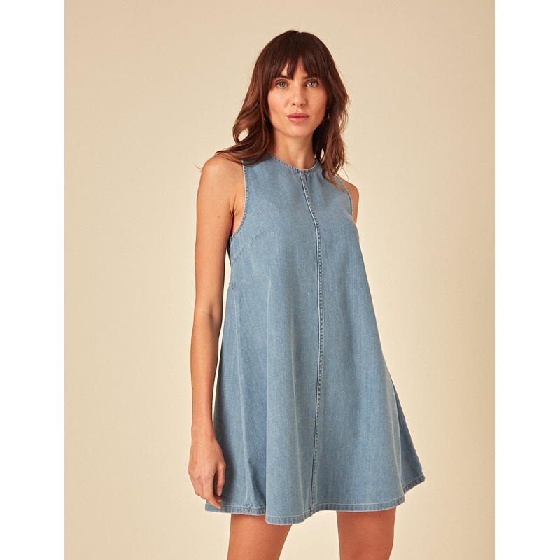 Bound to be part of your summer capsule wardrobe. This light wash denim mini has an effortless A-line swing shape. Turn around to reveal a buttoned back, and keyhole detail. Were wearing ours with trainers. Crew neck Keyhole back detail with buttons Size t