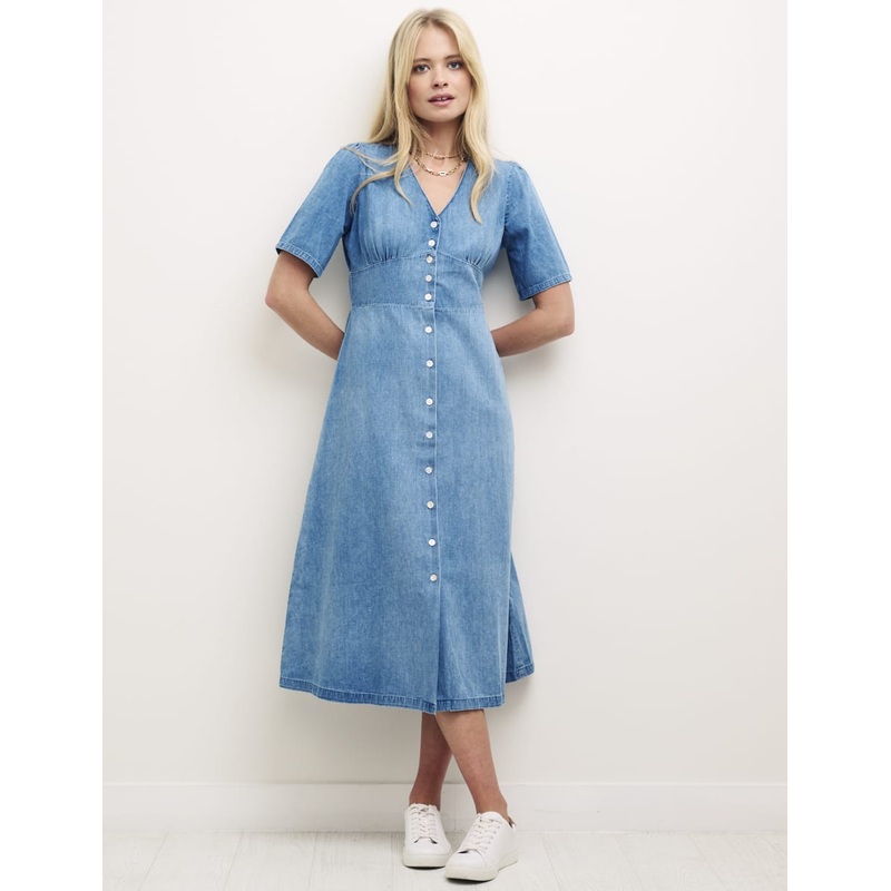 Our trophy style has had a denim makeover. Alexa is all about the vintage-inspired details, from the timeless tea dress cut to the delicate covered buttons. In a mid-blue wash thatll take you from week to weekend. Weve also added a subtle shirred back to gently pull you in at the waist. Just add trainers.