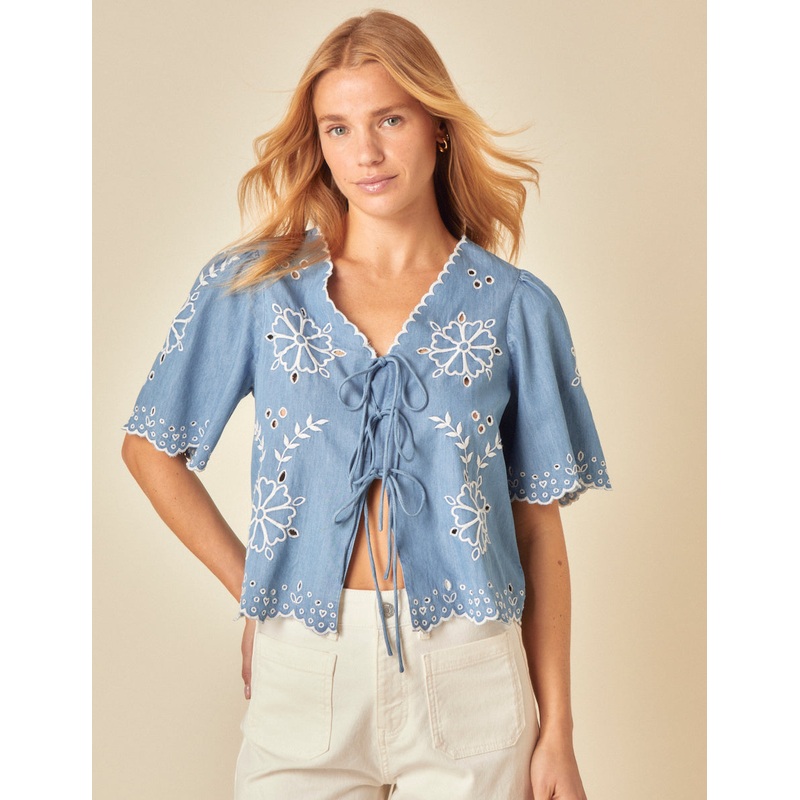All tied up. With contrast embroidery and scalloped edges, this denim top is made for pairing with jeans, skirts and sunshine. V-neck Short sleeves String tie detail Designed for a relaxed fit Size tip: we recommend your usual size