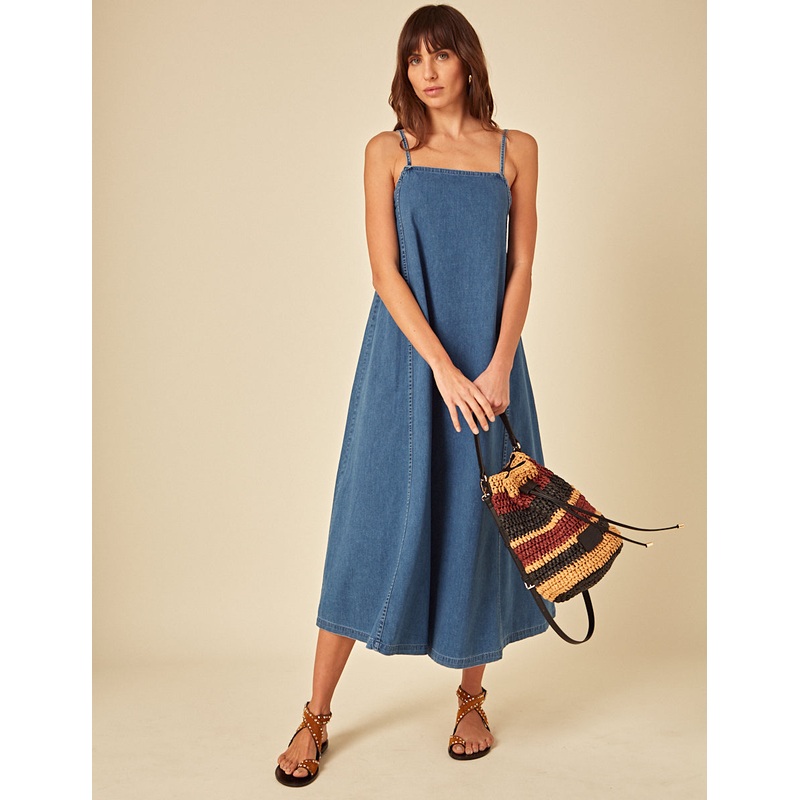The instant outfit. Coming in a mid-wash denim, our midi dress has a relaxed fit and easy trapeze shape. We love the tie detail at the back. Just add sandals and an iced coffee.Square neckAdjustable spaghetti strapsTie back detail