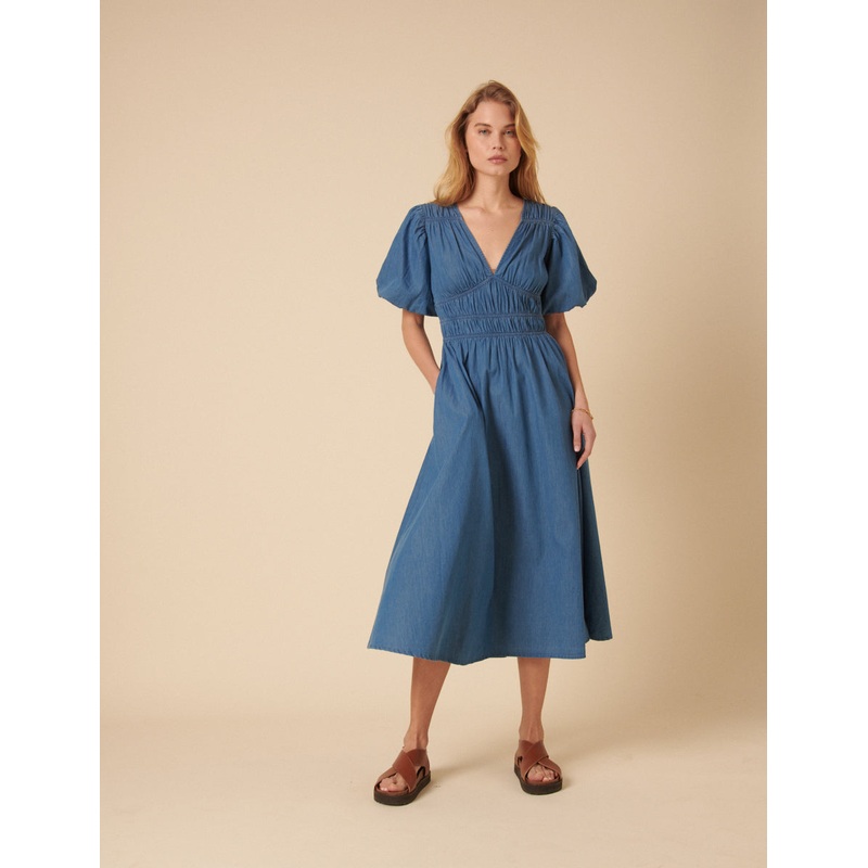 Dressed in denim. Coming in a light wash denim, we love her puff sleeves, feminine v-neck and effortless flowing silhouette. Just add sandals. Low v-neck Short puff sleeves Empire waistline A-line skirt that skims the body Size tip: we recommend your usual