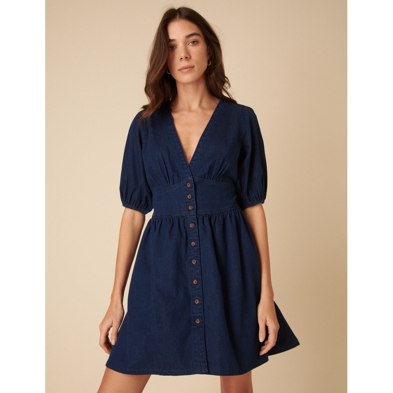 V-neck Short puff sleeves Button front Side pockets Size tip: we recommend your usual size