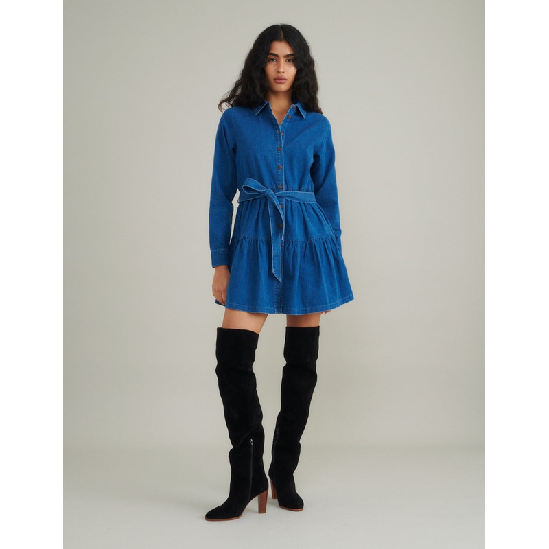 Your new favourite denim dress. Featuring in mid-wash, we love the button front and long sleeves. Dont miss the stylish thick belt thats designed to flatter. Wear yours with knee high boots to complete the look.