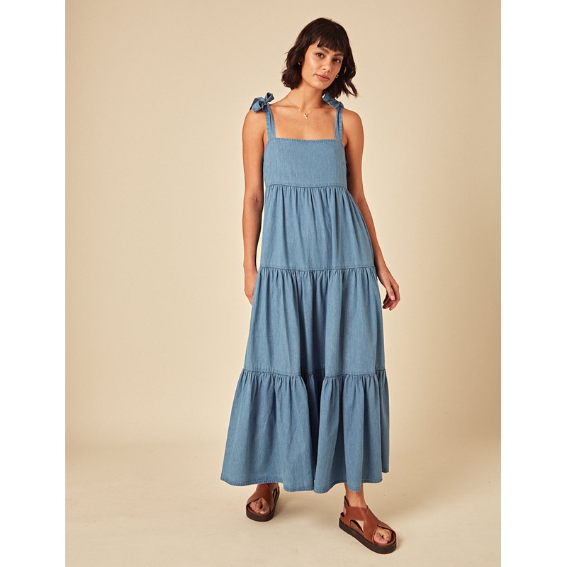 Dressed in denim. Coming in a light wash denim, our dress features a flowing tiered silhouette thats perfect for everyday. We love the tie straps too. Just add sandals.