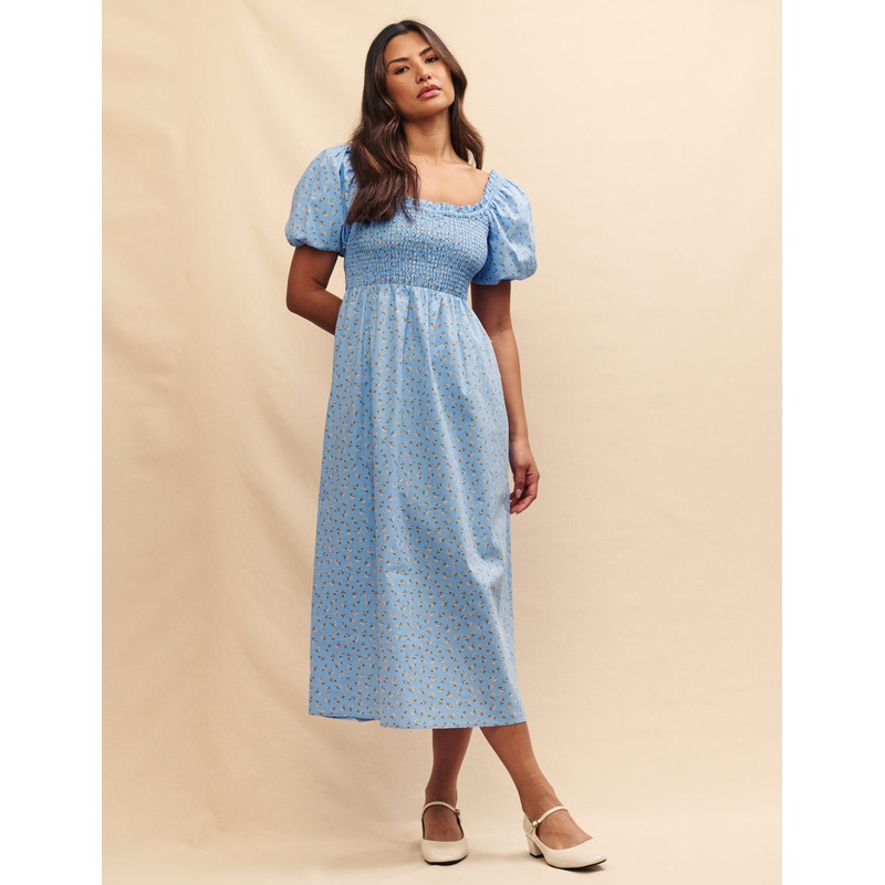 The dream. Known as Beau, this blue wildflower printed smock dress comes best paired with a glass of something chilled. Shes the perfect midi for sun-drenched days spent strolling around cobbled markets in new countries. Elevate yours with gold jewellery f