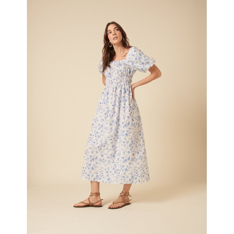 Your new go-to midi. Coming in pale blue ditsy floral print, our Kurtis midi dress features puffed sleeves, and a cinched waist to keep it modern. Style with sandals now, and barely-there heels later. Square neck Oversized puff sleeves Cinched waist for sh