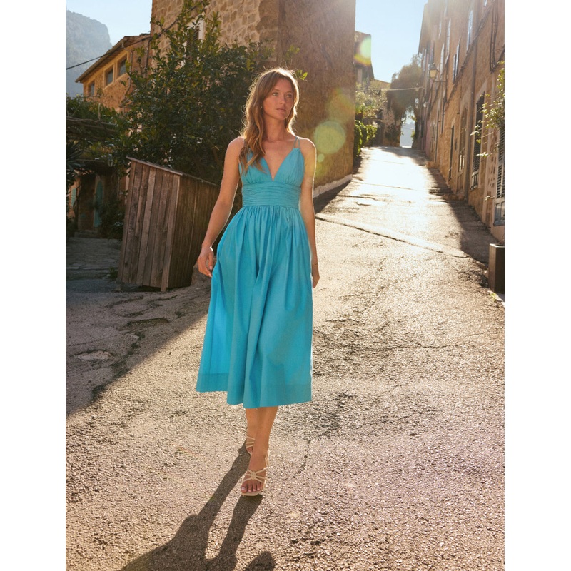 Step out in sunshine blue. A plunge neckline and pleated bodice offsets a swishy skirt. Dont miss the double straps both barely-there and made to be noticed. V-neck Panelled waistline designed to flatter Concealed zip fastening Designed to be semi-fitted S