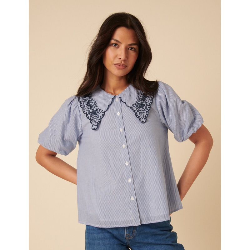 Drop collar Short puff sleeves Button front Designed to be semi-fitted Size tip: we recommend your usual size