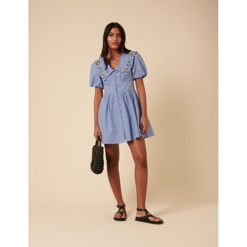 A moment for Birdie mini dress. Coming in pale blue, we love the embroidery along the Peter Pan collar. Shes complete with puff sleeves and a fitted waist. V-neck Short puff sleeves Button front Panelled waist designed to flatter Designed to be semi-fitted