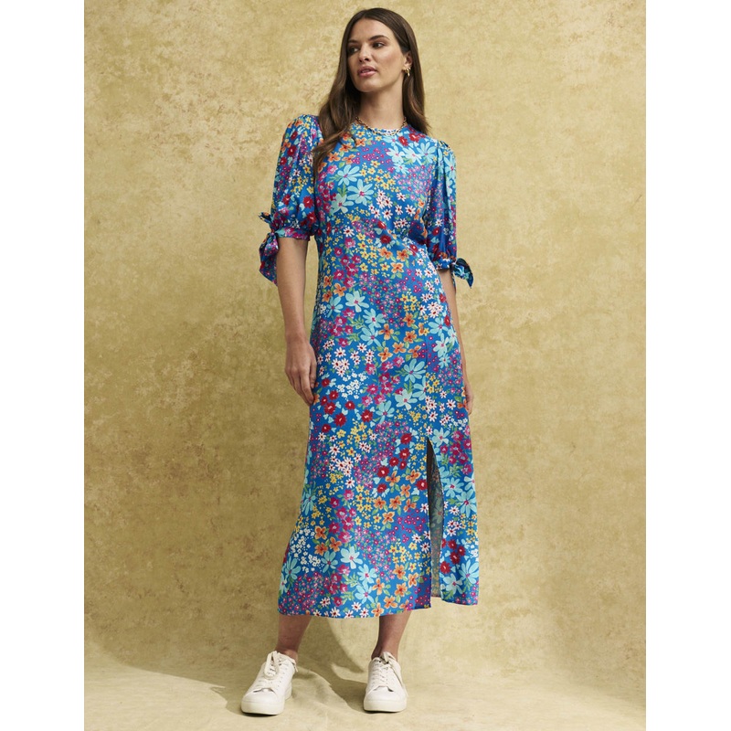 Putting a vintage twist on a classic style, our Esme midi is the ultimate tea dress. The blue fabric comes in our signature florals with a nipped-in waist and subtle side slit. Shes elevated by puff sleeves trimmed with a self-tie bow and shirring on the back. Dress her up with barely-there sandals or pare the whole look back with trainers.