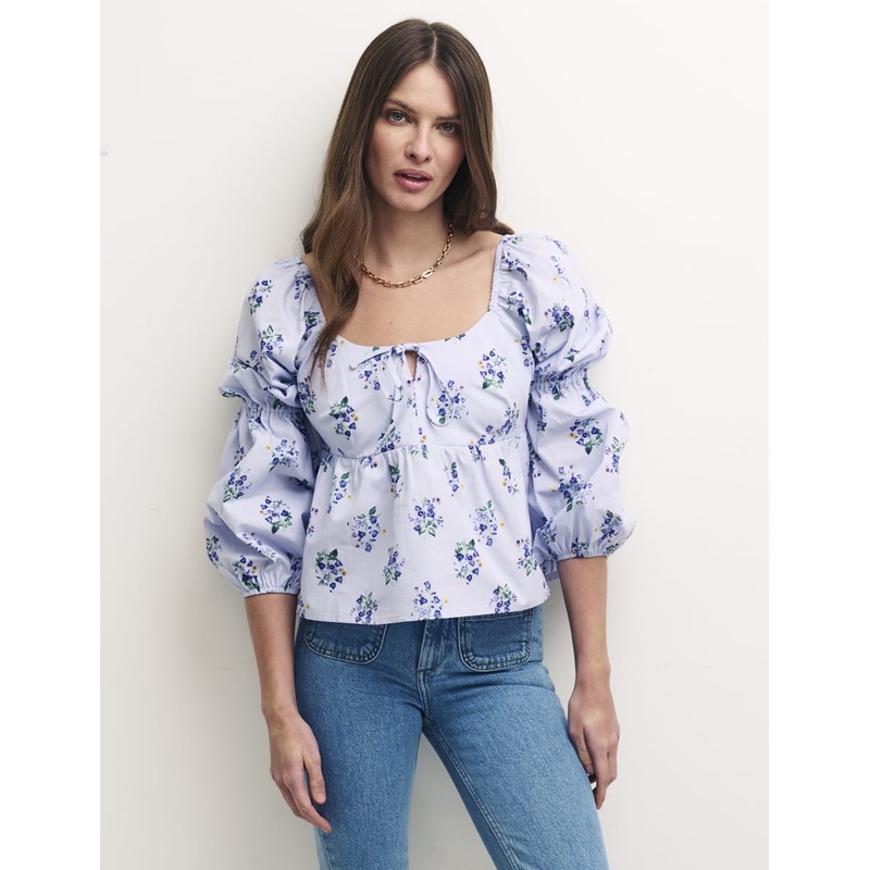 "Inspired by the milkmaid look, this cute top captures the spirit of a perfect summers day. The sleeves are long and double puffed. A scoop neck designed to follow your necklaces perfectly is finished with a pretty bow tie. We also love the waist-defining