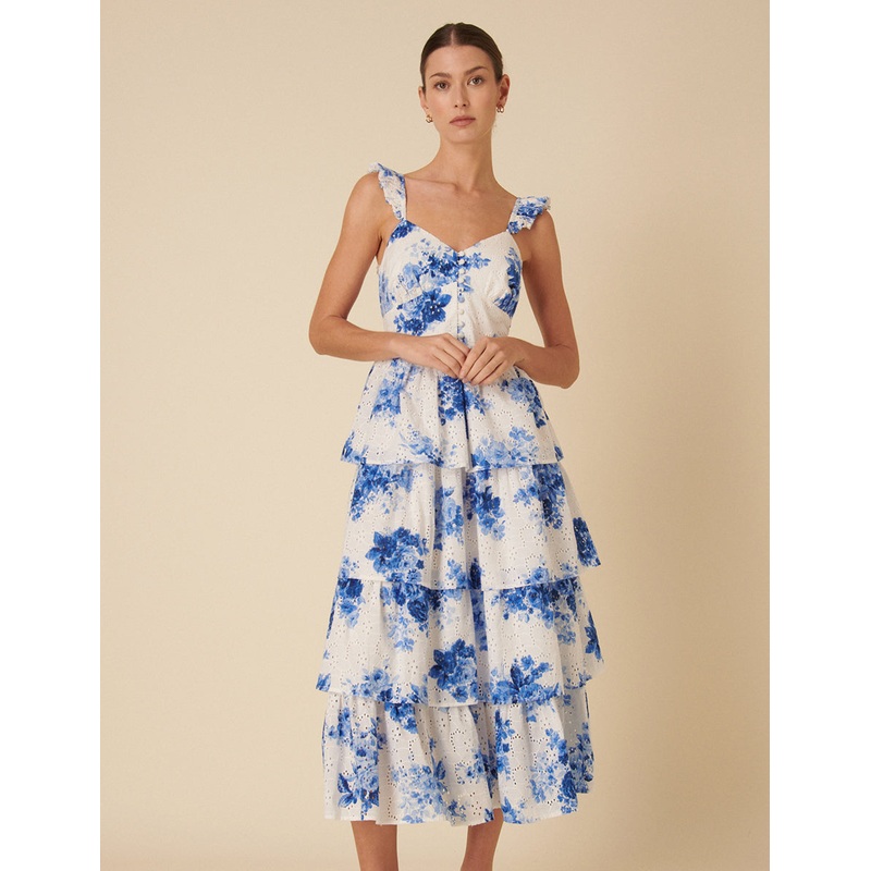 Meet Rhys, shes made for effortless summer days. Coming in classic blue-and-white florals, we love the sweetheart neckline and tiered layered skirt with our Rhys Midi Dress. Were wearing ours with barely-there heels. Sweetheart neckline Concealed zip faste
