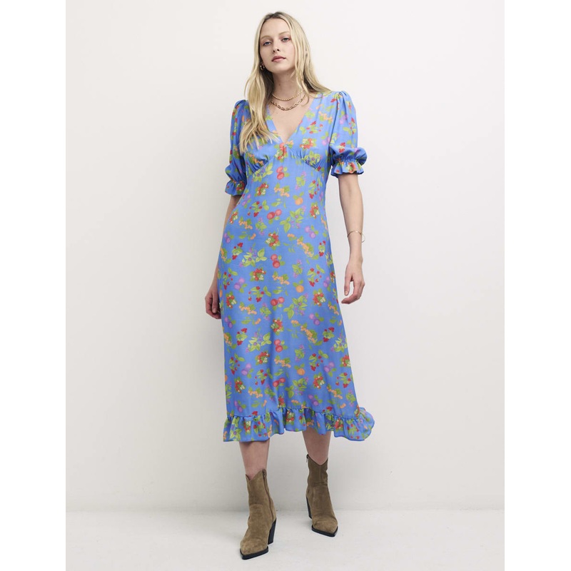 Delilah is a tea dress with a twist. This blue midi is covered with a floral tutti fruitti print. A low neckline plunges into a v-shape, offset by pretty puff sleeves trimmed with pleated edges and a frill hem. The cuffs have been stitched with a touch of