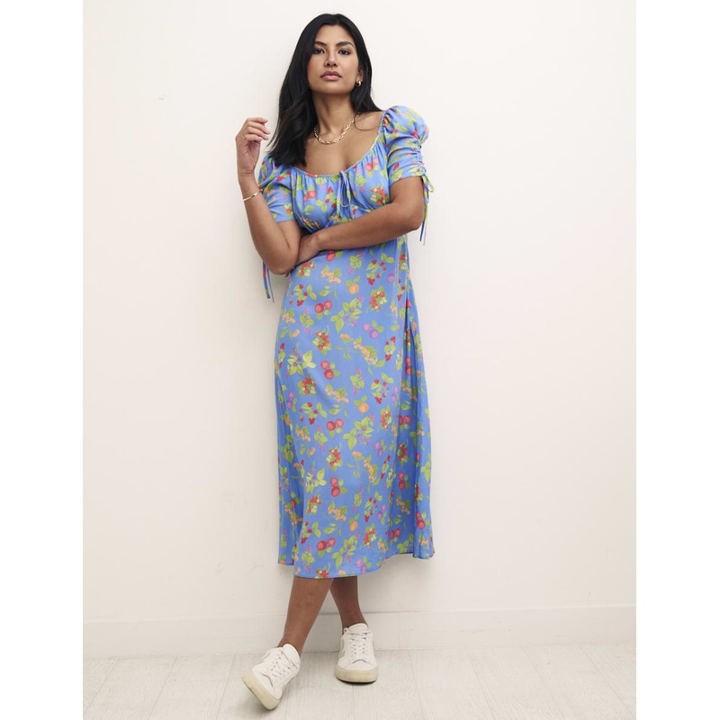 Another vintage-inspired dress for your collection this Pippa milkmaid midi features a blue tutti frutti print. Fancy details include the slightly puffed up sleeves and tie bows. Slip into suede boots and finish with gold hoops. Sweetheart neck Cap sleeves