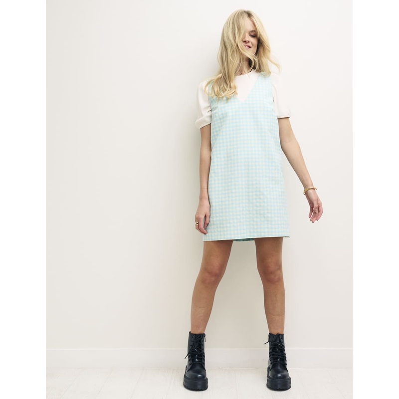 Cut with noughties nostalgia, this blue and white check pinny makes a stylish statement and were here for it. In one of our sell-out shapes, Style yours with a simple tee and chunky boots.V-neckPull on styleA-line skirt that skims the body