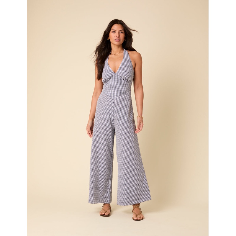 One for the gingham lovers. Finished with a halter neck, this blue and white jumpsuit ticks all the boxes with a breezy wide leg cut. Shirring at the back adds comfort. Halter neck Concealed zip fastening Wide leg cut that skims the body Designed to be sem