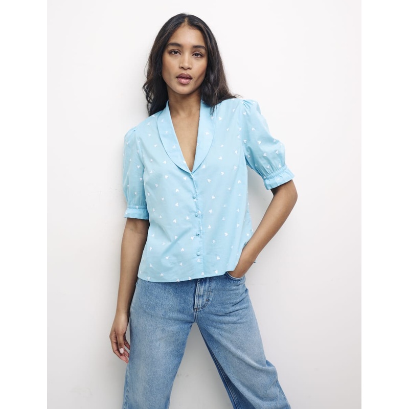 Swoon over this pretty blue shirt. Button her up and style simply with wide leg jeans.Small collarShort puff sleevesCovered buttons