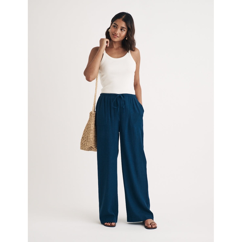And relax. These navy wide leg trousers come stitched with oversized pockets and a soft drawstring waist in a breezy fit. Team yours with a cute top and suede slip-on shoes. Drawstring waist Pockets Wide leg cut that skims the body