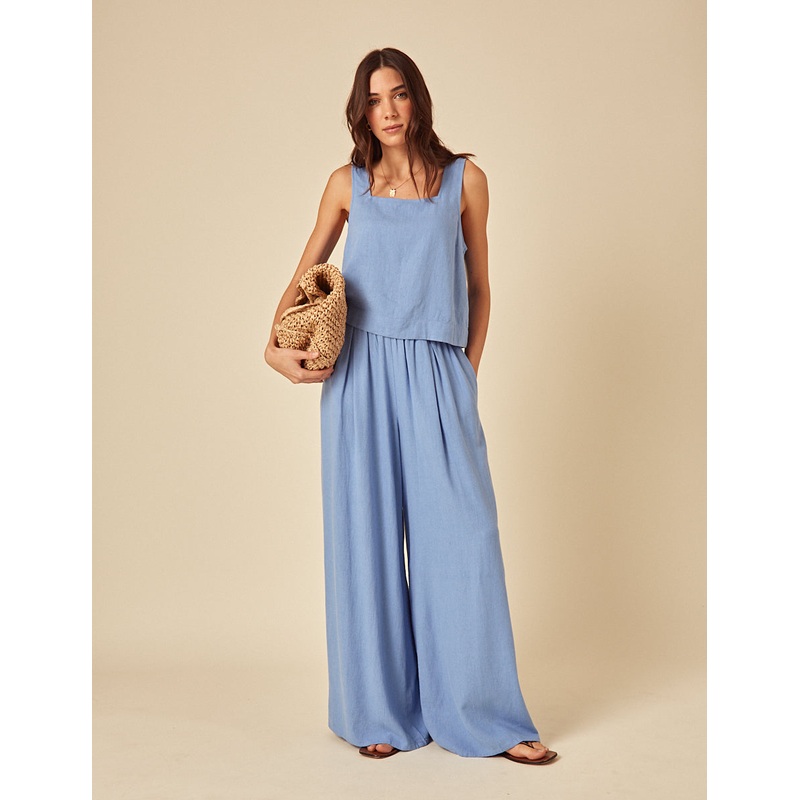 A new take on tailoring. Designed to flatter, our blue pleated pair nips in at the waist and falls effortlessly to a relaxed wide leg. Wear yours with our matching top or a beige knit. Wide leg cut Side pockets Elasticated back