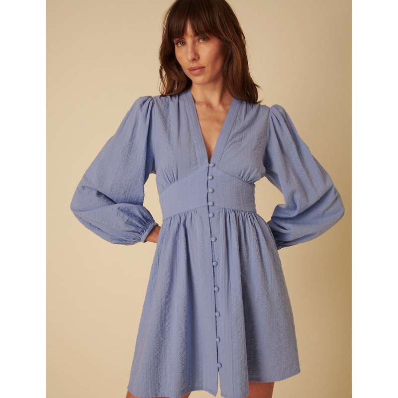 A new season take on our stellar style, Starlight. This blue mini is sure to turn heads. Were swooning over her puff sleeves and pretty line of buttons. Just add gold jewellery. Low v-neck Long balloon sleeves Covered buttons Panelled waist designed to fla