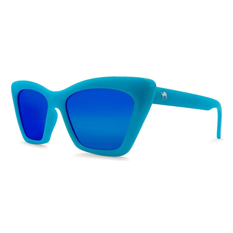CLEOCATRASERIES SIZE GUIDE REG FIT- 54MM LENS - POLARIZED Our Blue Oasis cat eye sunglasses are born from our travels through beautiful aqua lagoons and empty islands in search of untapped adventures. Daydreaming is the only side affect when wearing these