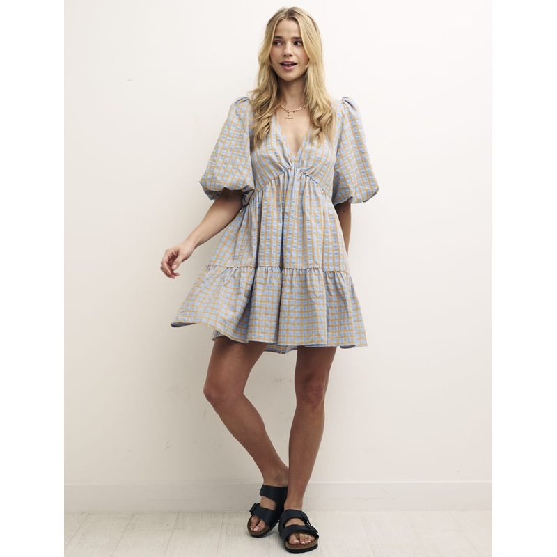 Making a statement in blue and orange check, our Vienna smock dress calls for days spent in the sun, whether its at home or on foreign shores. The fit is relaxed and roomy. She then plunges to a low v-neck before flipping into a tiered skirt with tie detai