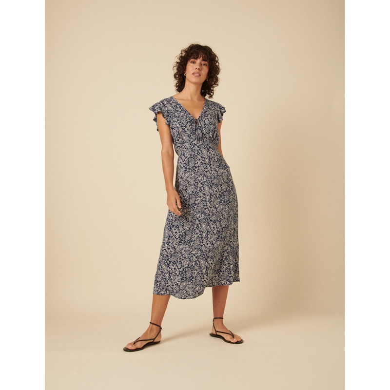 The staple dress your wardrobe needs. Coming in navy with a delicate paisley print, we love the V-neckline with tie detail and the pretty flounced sleeves. Simply style with sandals. V-neck Size tip: we recommend your usual size